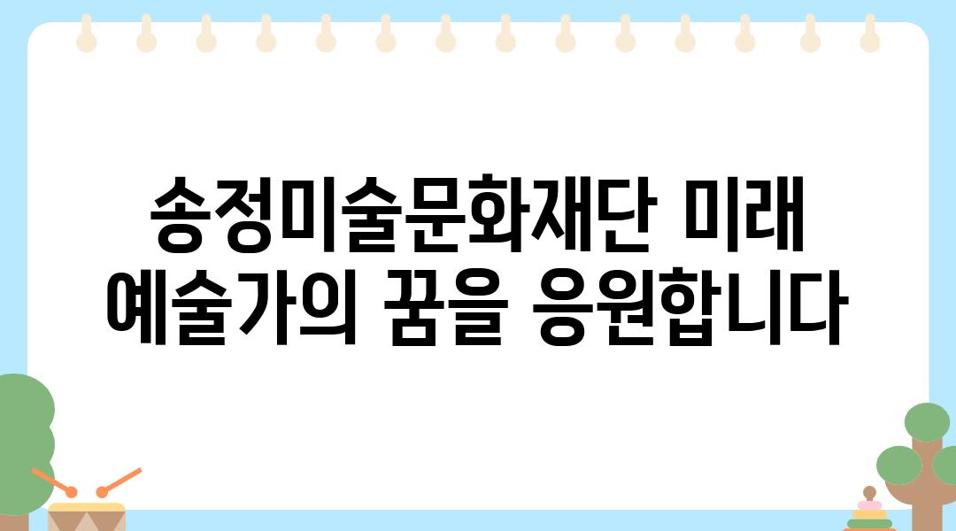 송정미술문화재단은 미래의 예술가를 육성하고 예술계 발전에 기여하고자 설립되었습니다. 재단의 장학금은 예술 분야에 재능 있는 학생들에게 꿈을 향한 용기를 북돋아주고, 창의적인 미래를 열어줍니다.