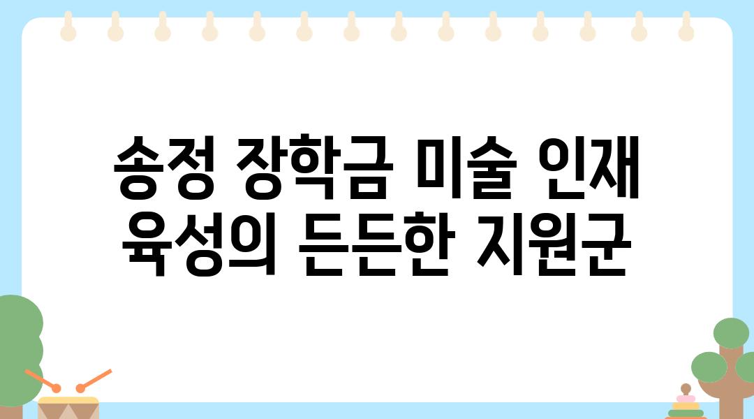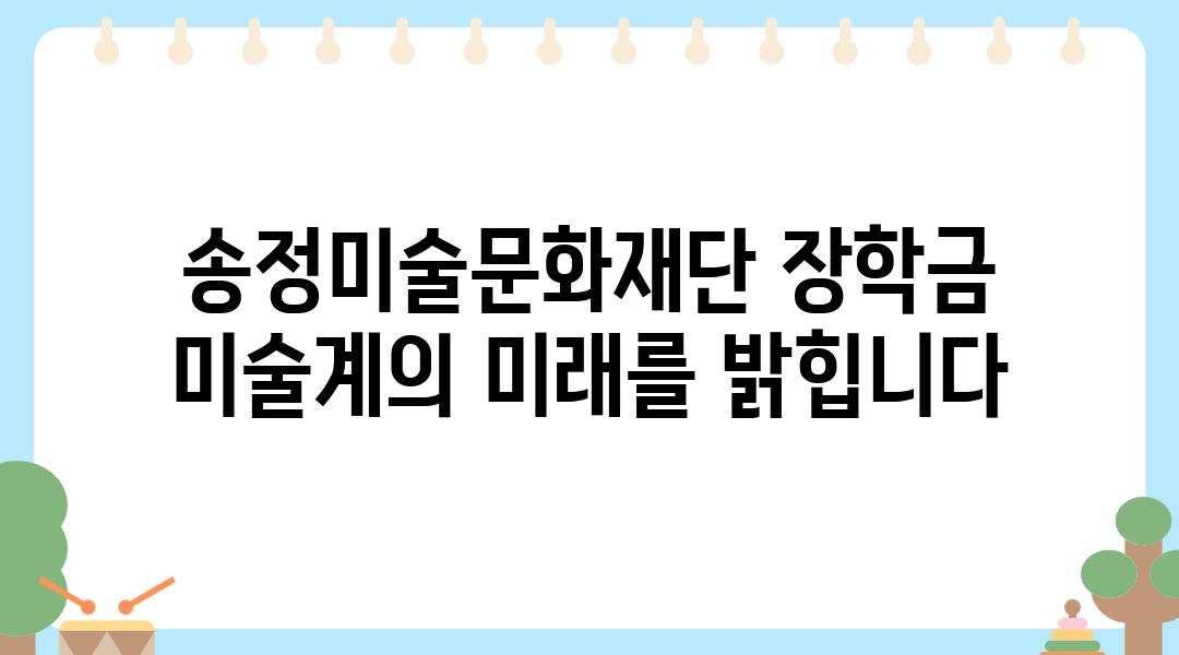 송정미술문화재단 장학금은 미술 분야에 열정을 가진 모든 학생들에게 열려 있습니다. 자세한 정보와 지원 방법은 재단 홈페이지를 통해 확인할 수 있습니다.